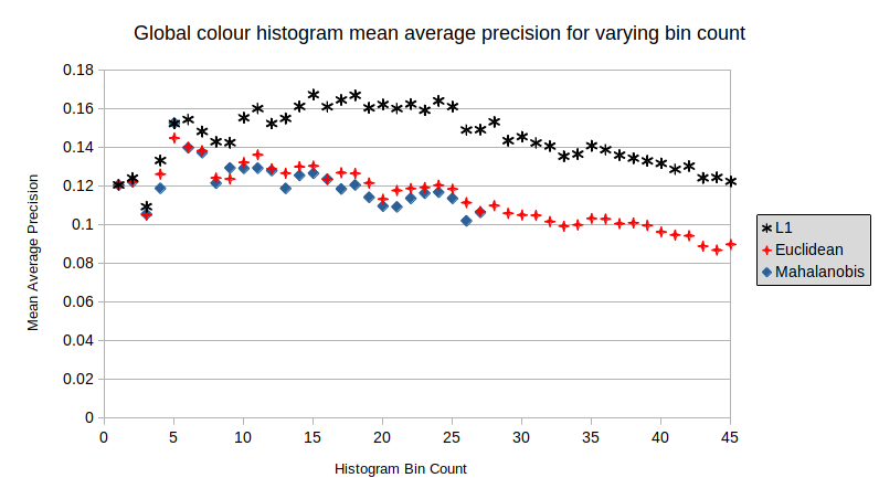 Performance differences for each distance measure for global colour histogram descriptor for varying bin counts. Link to heading
